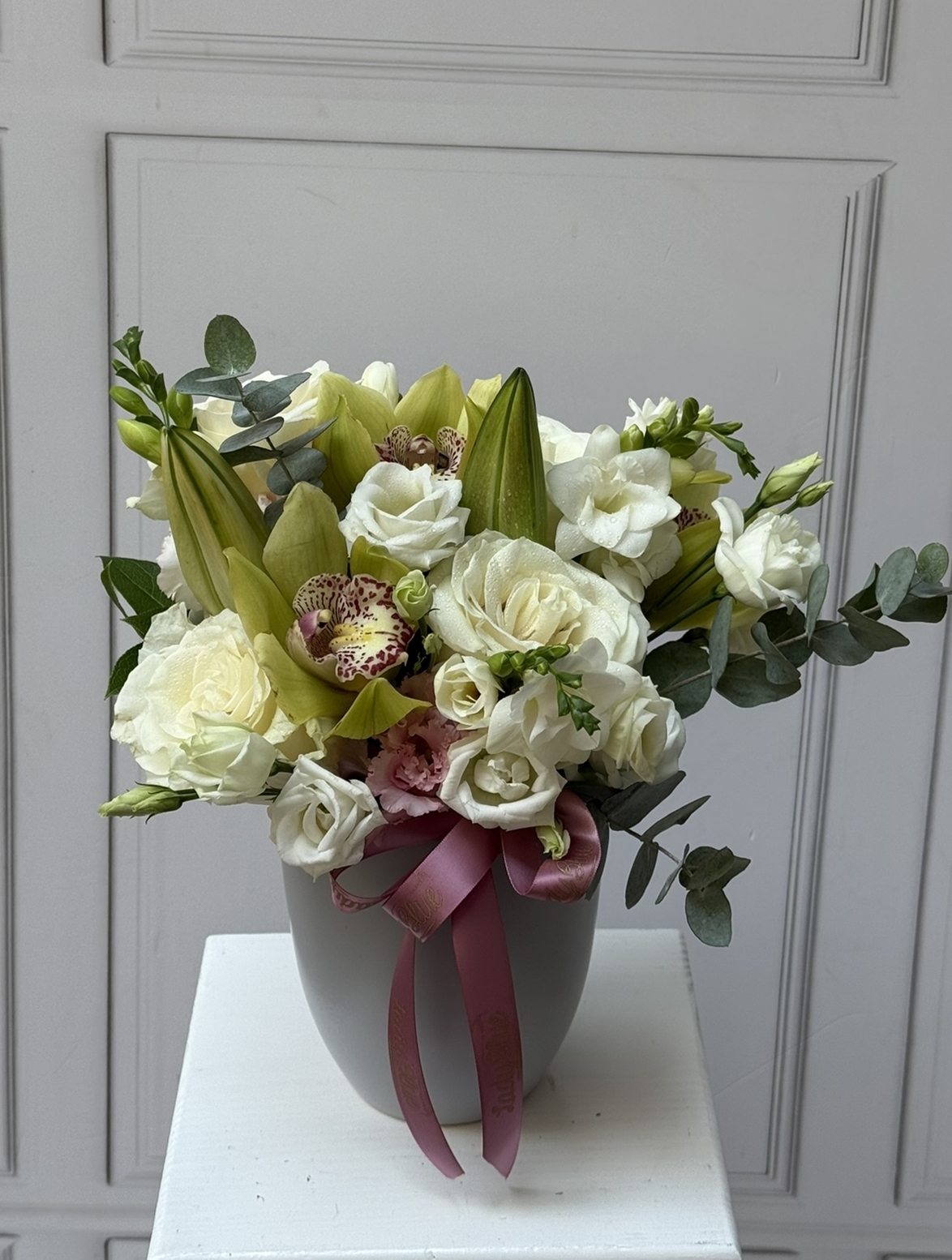 325 RonAcest aranjament este realizat intr-un vas ceramic si are in compozitie 1 crin imperial,3 trandafiri,2 cupe orhidee,5 fezii,3 eustoma,5 eucalipt ,burete floral si alte elemente decorative.Pretul produsului ales include o felicitare pe care va fi scris textul ales de dvs.