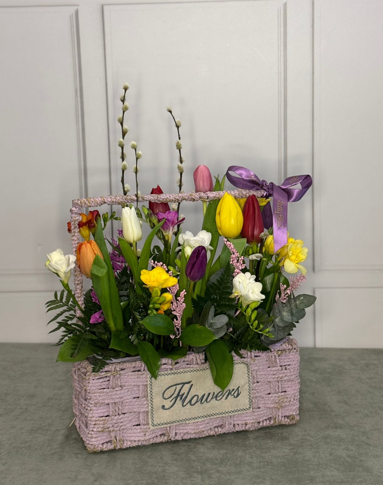 354 RonAranjamentul este compus din 25 fire mixte multicolore de lalele,frezii,5 salix, 5 eucalipt,5 salal, 5 ruscus,frunze decorative, cos decorativ,burete pentru flori,folie,panglica saten si alte accesorii.Pretul produsului ales include o felicitare , pe care va fi scris textul ales de dvs.Florile, cutia de catifea pot suferi modificari in functie de stocul disponibil.Inaltime 25 cm, diametru 15 cm