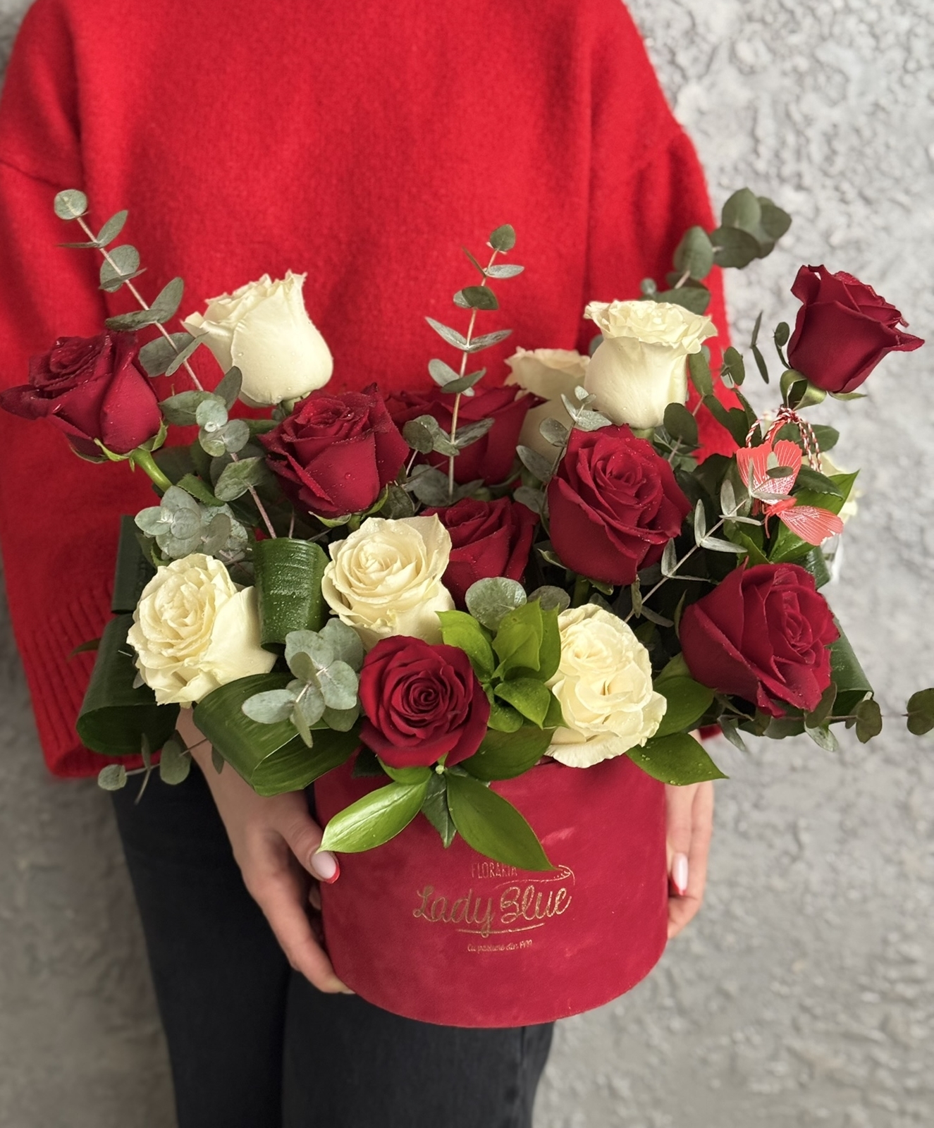 410 RonAranjamentul este realizat din 15 trandafiri(7 rosii,8 albi),cutie catifea, burete floral,6 eucalipt,8 ruscus, 5 salal,pistache inima decorativa si alte materiale. . Pretul produsului ales include o felicitare cadou, pe care va fi scris textul ales de dvs.Florile, cutiile, vasele pot suferi modificari in functie de stocul disponibil.